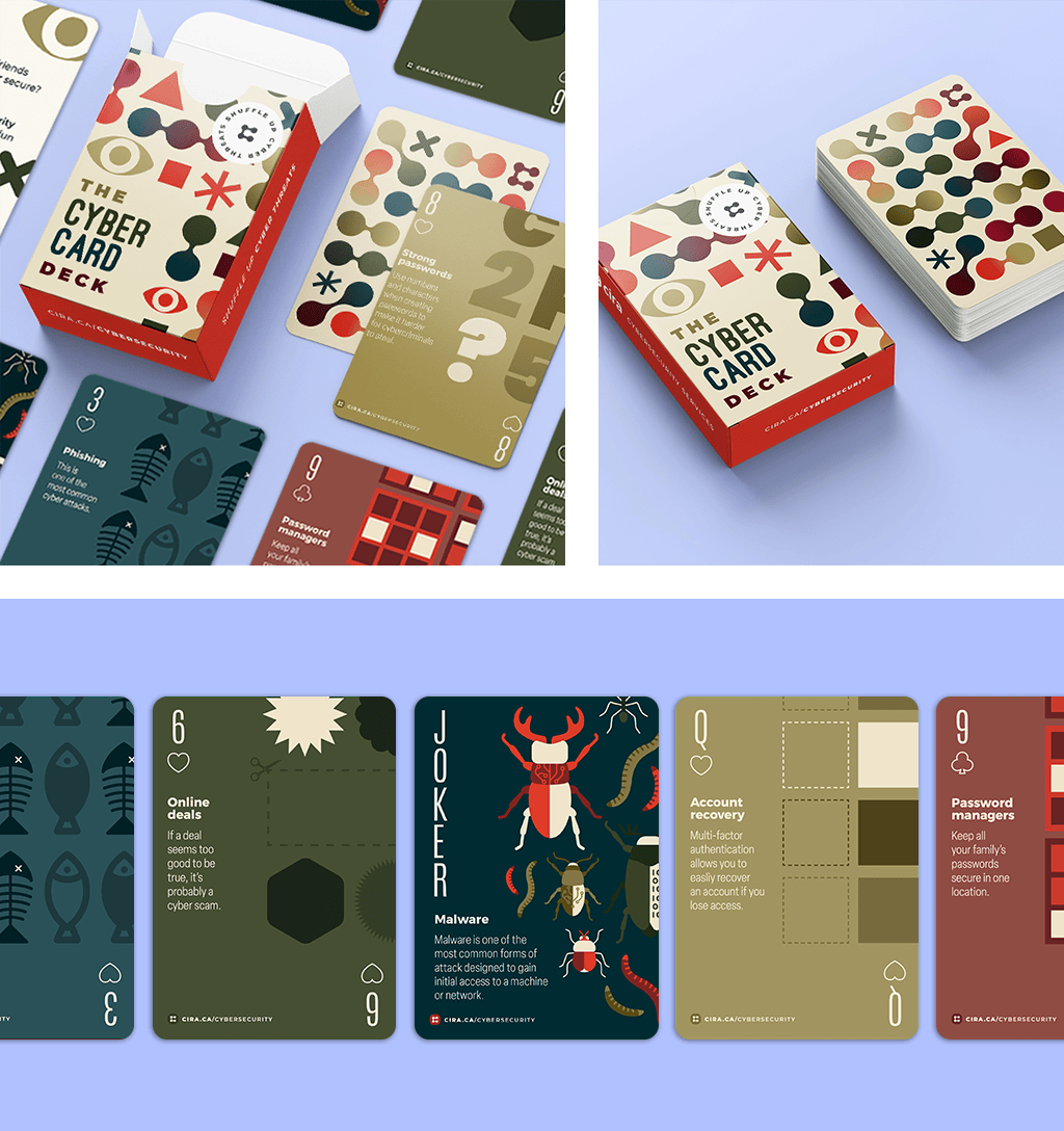 Branching away from conventional promo items like mugs and pens, we opted for a fully custom approach with the CIRA Cybersecurity Deck. The objective was to create a thoughtful and informative product that positions CIRA as thought leaders in the Cyber community. Simultaneously, this cybersecurity training tool serves as a classic card deck, increasing the likelihood of it being utilized and even making its way to a cottage rather than being stashed away in a drawer.